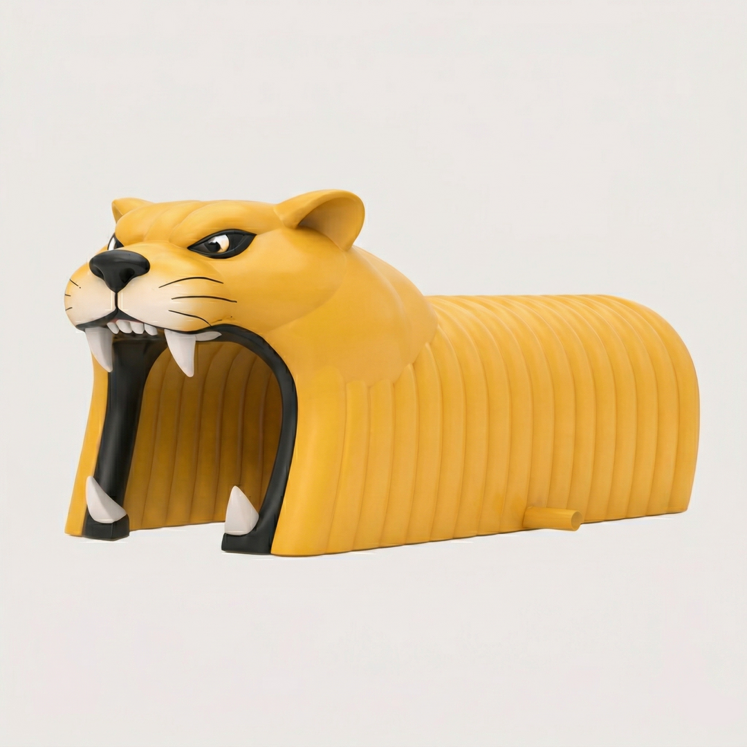 Once approved, your tunnel is cut, printed with dye-sublimation on 300D or 600D polyester, and hand-assembled at our facility. Every seam is inflation-tested before it ships. Standard turnaround is 7–12 business days from artwork approval.